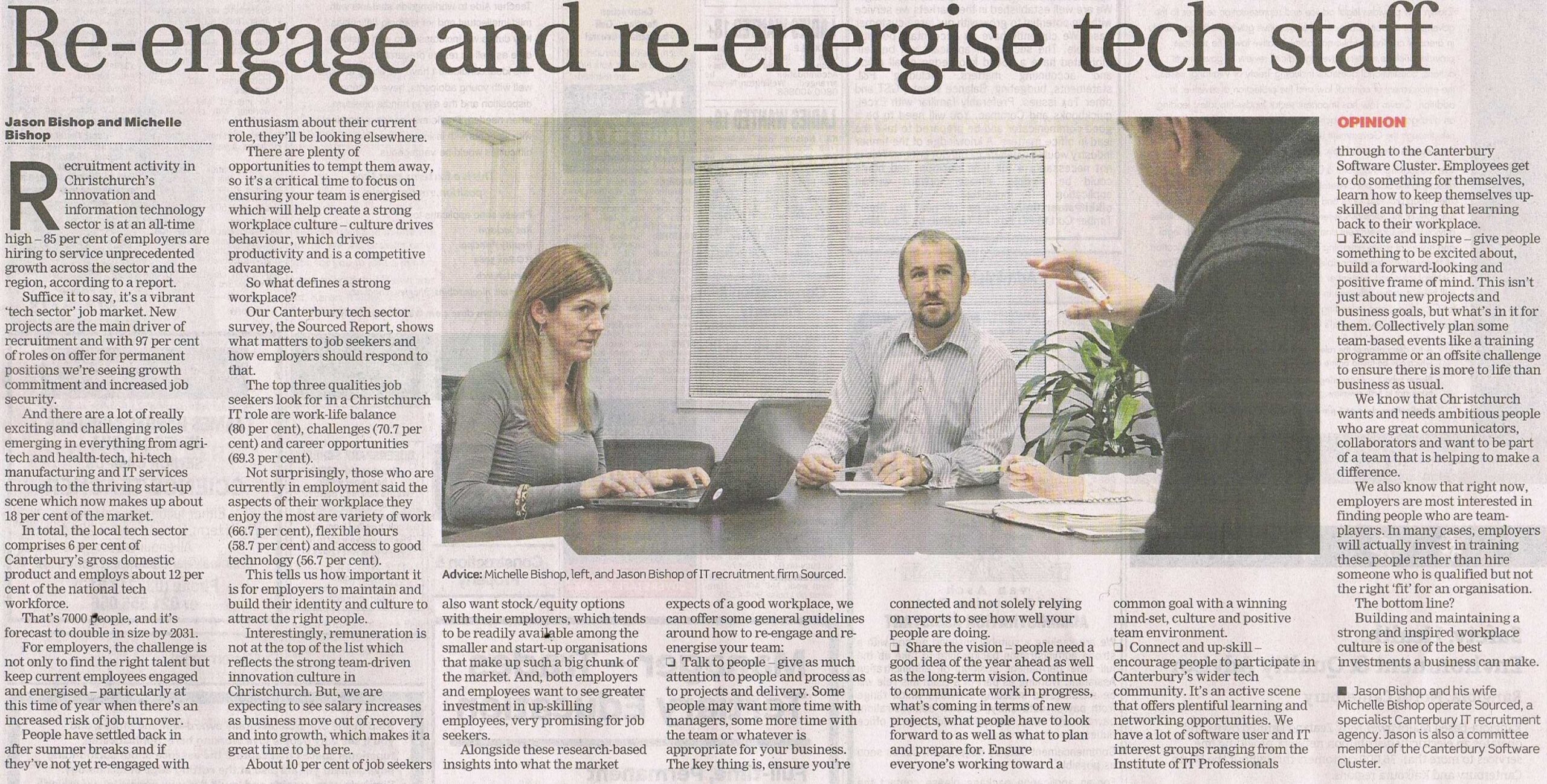 Re-engage re-energise tech staffRecruitment activity in Christchurch’s innovation and information technology sector is at an all-time high – 85% of employers are hiring to service unprecedented growth across the sector and the region. Suffice it to say, it’s a vibrant ‘tech sector’ job market. New projects are the main driver of recruitment and with 97% of roles on offer for permanent positions we’re seeing growth commitment and increased job security.And there are a lot of really exciting and challenging roles emerging in everything from agri-tech and health-tech, high-tech manufacturing and IT services through to the thriving start-up scene which now makes up about 18% of the market.In total, the local tech sector comprises 6% of Canterbury’s GDP and employs around 12% of the national tech workforce.That’s 7,000 people, and it’s forecast to double in size by 2031. For employers, the challenge is not only to find the right talent but keep current employees engaged and energised – particularly at this time of year when there’s an increased risk of job turnover.People have settled back in after summer breaks and if they’ve not yet re-engaged with enthusiasm about their current role, they’ll be looking elsewhere.There are plenty of opportunities to tempt them away, so it’s a critical time to focus on ensuring your team is energised which will help create a strong workplace culture – culture drives behaviour, which drives productivity and is a competitive advantage.So what defines a strong workplace? Our Canterbury tech sector survey, the Sourced Report, shows what matters to job seekers and how employers should respond to that. The top three qualities job seekers look for in a Christchurch IT role are work/life balance (80%), challenges (70.7%) and careeropportunities (69.3%).Not surprisingly, those who are currently in employment said the aspects of their workplace they enjoy the most are variety of work (66.7%), flexible hours (58.7%) and access to good technology (56.7%). This tells us how important it is for employers to maintain and build their identity andculture to attract the right people.Interestingly, remuneration is not at the top of the list which reflects the strong team-driven innovation culture in Christchurch. But, we are expecting to see salary increases as business move out of recovery and into growth, which makes it a great time to be here. Around 10% of job seekers also want stock/equity options with their employers, which tends to be readily available among the smaller and start-up organisations that make up such a big chunkof the market. And, both employers and employees want to see greater investment in up-skilling employees, very promising for job seekers.Alongside these research-based insights into what the market expects of a good workplace, we can offer some general guidelines around how to re-engage and re-energise your team: Talk to people – Give as much attention to people and process as to projects and delivery. Some people may want more time with managers, some more time with the team or whatever is appropriate for your business. The key thing is ensure you’re connected and not solely relying on reports to see how well your people are doing. Share the vision – People need a good idea of the year ahead as well as the long-term vision. Continue to communicate work in progress, what’s coming in terms of new projects, what people have to look forward to as well as what to plan and prepare for. Ensure everyone’s working toward a common goal with a winning mind-set, culture and positive team environment. Connect and up-skill – Encourage people to participate in Canterbury’s wider tech community. It’s an active scene that offers plentiful learning and networking opportunities. We have a lot of software user and IT interest groups ranging from the Institute of IT Professionals through to the Canterbury Software Cluster. Employees get to do something for themselves, learn how to keep themselves up-skilled and bring that learning back to their workplace. Excite and inspire – Give people something to be excited about, build a forward-looking and positive frame of mind. This isn’t just about new projects and business goals, but what’s in it for them. Collectively plan some team-based events like a training programme or an offsite challenge to ensure there is more to life than business as usual.We know that Christchurch wants and needs ambitious people who are great communicators, collaborators and want to be part of a team that is helping to make a difference. We also know that right now, employers are most interested in finding people who are team-players. In many cases, employers will actually invest in training these people rather than hire someone who is qualified but not the right ‘fit’ for an organisation.The bottom line? Building and maintaining a strong and inspired workplace culture is one of the best investments a business can make.If you want to be a part of the Christchurch IT sector, get in touch on (03) 420 2999 or visit www.sourced.kiwi for more information, including the latest Sourced Report.