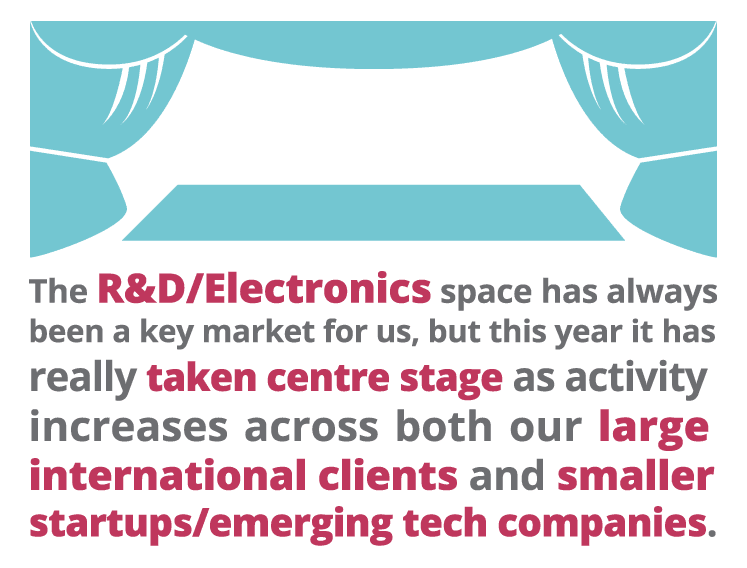 Interestingly, Electronics kept us busy right through the second quarter within the Embedded Firmware, Hardware and Test areas. The R&D/Electronics space has always been a key market for us, but this year it has really taken centre stage as activity increases across both our large international clients and smaller startups/emerging tech companies.